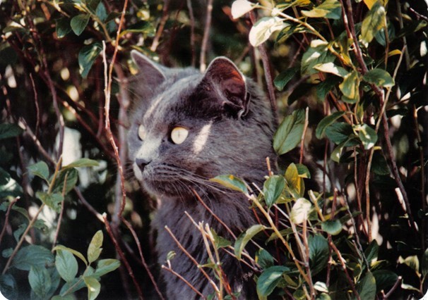 As the months passed Sam grew from the ugliest kitten ever into a small, long=haired, gray cat. She was lovely really. Her coat was the color of woodsmoke, soft and fluffy as down. Her bright yellow eyes contrasted with the gray, making her more striking looking. Sam did not meow, her voice stayed small, too, sounding more like mew than MEOW. Her purr was louder by comparison, louder than the purr of the biggest cat in the house.
